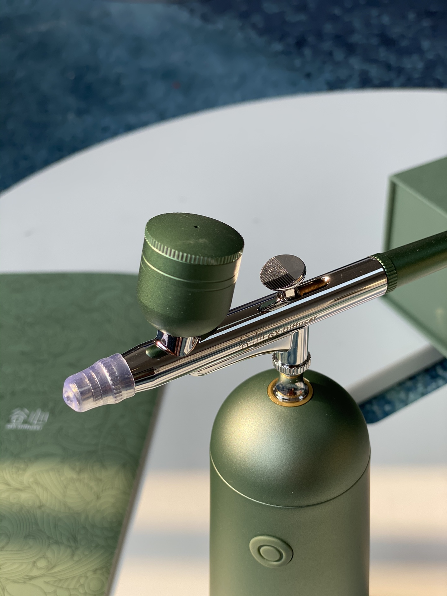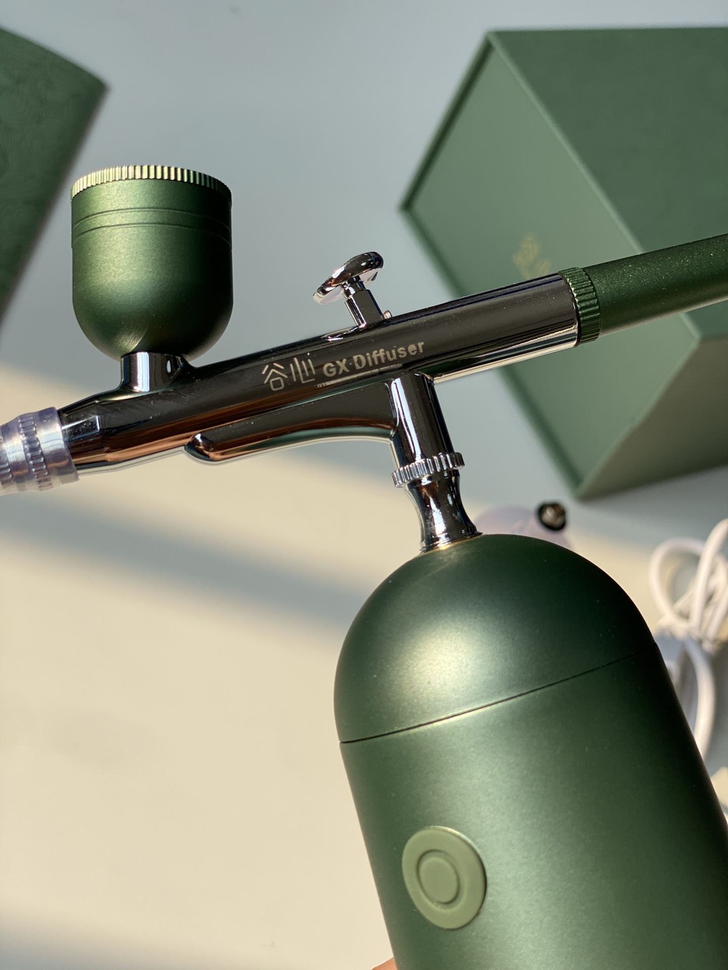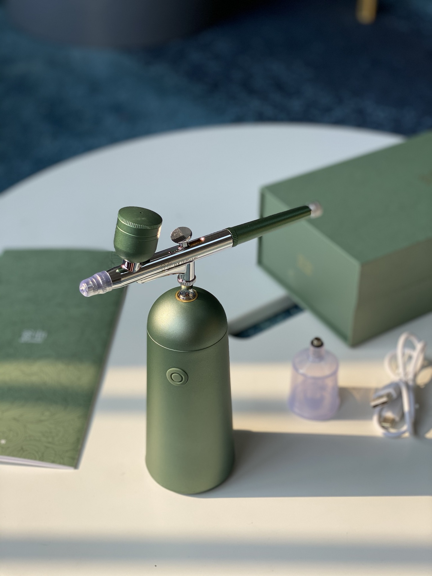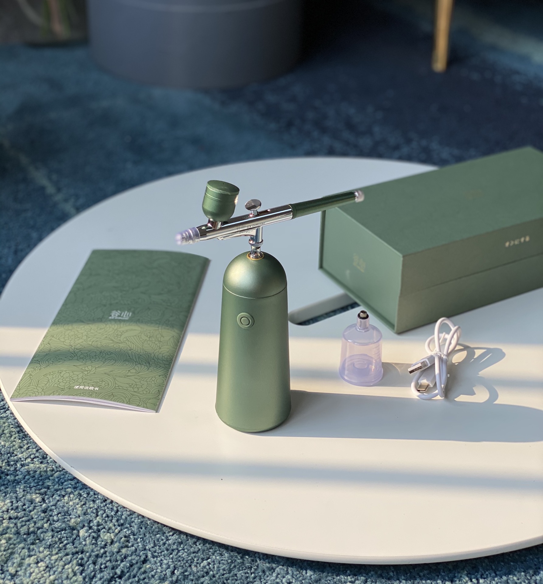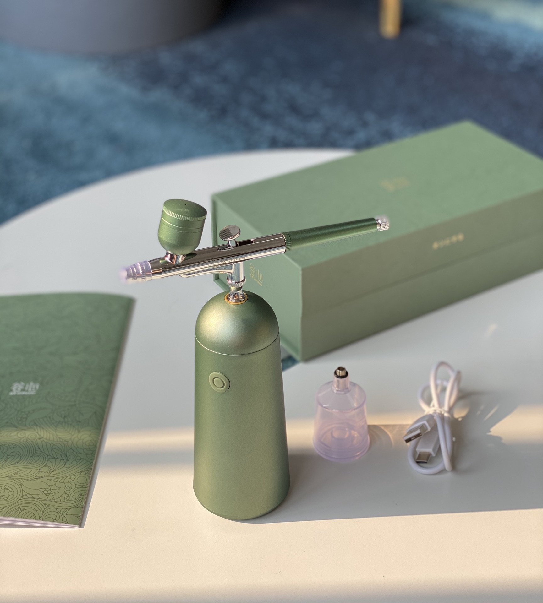 Máy gồm 2 cốc đựng nguyên liệu 1 to 1 nhỏ , đầu phun và máy nén dùng pin sạc qua Usb với 2 phiên bản gồm mẫu cơ bản lực nén 130kpa và mẫu nâng cao có hoa văn + 140kpa , 2 màu xanh và tím tuỳ chọn nha